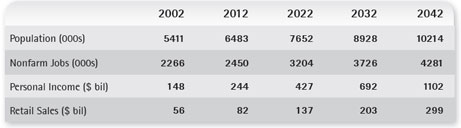Hangover from the Great Recession continues to throttle growth, but Arizona will eventually rank amongst the fastest-growing states once again. In the annual update of our 30-year projections, we show Arizona’s population topping 10.2 million in the year 2042. That will easily put Arizona among the top-ten ranked states for the most residents. By 2042, nearly four million more people than live here today will call Arizona home. Projections for each 10-year interval for selected aggregate measures are presented in Exhibit 2.