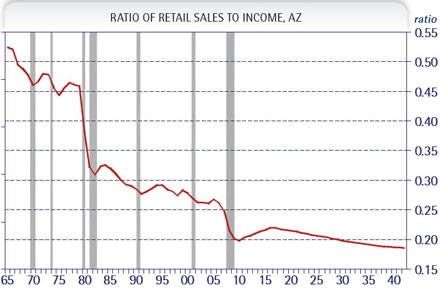 - Retail sales relative to income fell significantly during the Great Recession, dropping below 20% from nearly 53% in the mid-1960s. An aging population that spends more on services (especially health care) and a smaller portion on taxable goods, along with a narrowing of the tax base, accounts for the drop. This ratio will sink to an all-time low of 18.6% in another 30 years. This has serious implications for a tax system heavily reliant on retail sales (Exhibit 3).