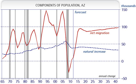 - Over the long term, migration flows will continue to account for the lion’s share of population growth. On average, natural increase (births minus deaths) accounts for one third while net migration provides the remainder. The latter varies significantly, of course, over the business cycle. During the recession, with mobility rates at a six-decade low, migration flows swung deeply negative for the first time in recorded history. By 2016 net migration will again approach 95,000 annually. Natural increase moved significantly lower during the recession due to falling births, but will stabilize at 40,000 new residents annually in the near term, before moving lower as the population ages (Exhibit 4).