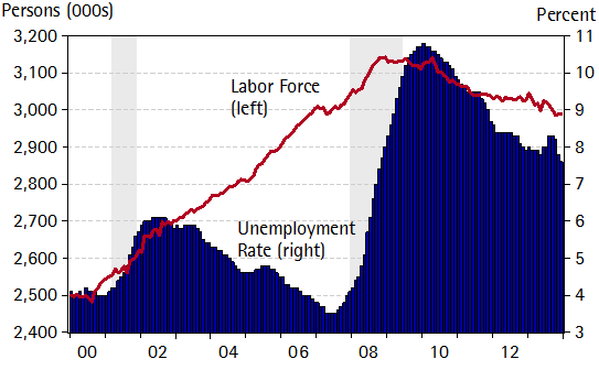 Last year marked another modest labor market improvement for the nation. Total nonfarm employment rose 1.7%, equal to the growth rate for 2012. The national unemployment rate declined for the third consecutive year in 2013, to 7.4%. However, this improvement was accompanied by a steady decline in labor force participation, which is down from 64.7% in 2010 to 63.2% in 2013. Part of the decline in labor force participation is being driven by baby boom retirements. However, since we have also seen declining labor force participation in the prime working age group (age 25-54) and this suggests that the labor market has still not fully recovered.