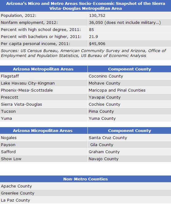 Arizona has a new metropolitan area, bringing the state total to seven. The Office of Management and Budget (OMB) released the most recent list of Metropolitan and Micropolitan Statistical Areas in February 2013 and it revealed a few changes for Arizona. The title for the Phoenix metropolitan area reverted back to Phoenix-Mesa-Scottsdale (it had been called Phoenix-Mesa-Glendale for the last four years), the Safford Micropolitan Area now encompasses only Graham County (Greenlee County is no longer included). The most significant change was that Sierra Vista-Douglas has been reclassified from a micropolitan area to a metropolitan area, making it the seventh in the state and encompasses all of Cochise County. Metropolitan and micropolitan areas reflect local labor markets, as far as that is possible using counties as the basic geographic building blocks.