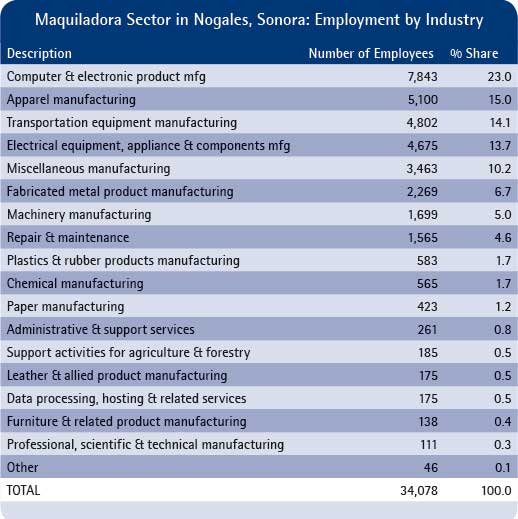 At present, the maquiladora sector in Nogales, Sonora is about 34,000 jobs strong and has more than 100 plants.[2] Three industry sectors account for more than 50% of all employment: computer and electronic product manufacturing (23.0%), apparel manufacturing (15.0%), and transportation equipment manufacturing including components and parts for aerospace industry (14.1%). When electrical equipment and components manufacturing (13.7%), and miscellaneous manufacturing (10.2%) are added, these five industry sectors account for 76% of the maquiladora sector (Table 1).[3] Other sectors represented include fabricated metal product manufacturing; machinery manufacturing, repair of equipment; plastics and rubber products manufacturing, chemical manufacturing, and paper products manufacturing. Additional ten sectors are represented with employment of less than 1% of the total.