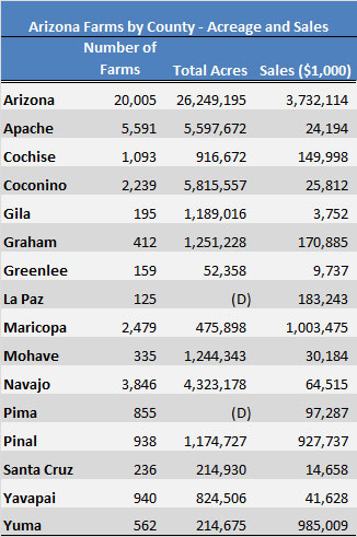 There were 33,613 farmers in Arizona operating 20,005 farms on 26.2 million acres in 2012. While the number of acres being farmed in Arizona has remained essentially unchanged during this time frame, both the number of farmers and the number farms in Arizona grew by a startling 28% between 2007 and 2012 while the total number of farmers in the U.S. actually declined by 3% and the number of farms decreased 4%. This interesting result is driven by the fact that average farm size in Arizona has been shrinking. The average farm in Arizona was 1,670 acres in 2007, and by 2012 this figure had declined to 1,312 acres. Farms and ranches in most western states are typically much larger when compared to the nation. The average farm size in the U.S. in 2012 was 424 acres. So when compared to the nation, farm size in Arizona is still relatively large, in fact, Arizona is 6th in terms of average farm size, behind only Wyoming, Montana, New Mexico, Nevada and South Dakota.