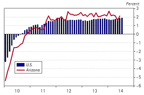 Arizona’s year-over-year job growth softened in the spring of 2014, falling from 2.4% in the first quarter to 1.9% in the second. Statewide job growth in the second quarter fell back to the national rate, something we have not seen since early 2012 (Exhibit 1).