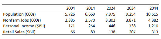 Steady job gains will contribute to personal income growth by generating gains in wages and fringe benefits. The state’s income growth will also receive a boost from increased asset income (dividends, interest, and rent) as well as transfer payments. The forecast calls for transfer payments, which include Social Security, Medicare, Medicaid, and other welfare transfers, to account for 30.9% of personal income by 2044, up from 20.4% in 20.3% in 2014.