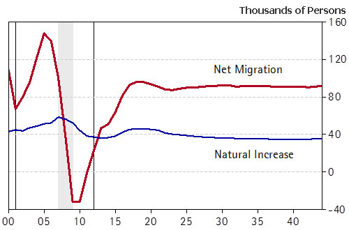 The forecast calls for Arizona’s population to rise at an average rate of 1.5% per year during the next 30 years. Growth is stronger in the near term, as accelerating net migration and a modest improvement in natural increase (births minus deaths) both contribute to growth (Exhibit 4). However, after 2018 net migration plateaus and natural increase loses steam, pulling Arizona’s population growth down with it. Declining natural increase reflects the coming demographic aging, which drags down births and boosts deaths. Even with slowing growth during the long-run, Arizona will continue to outpace national population growth.
