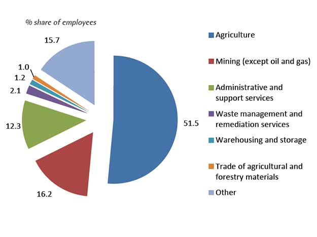Non-manufacturing activities in the IMMEX program include establishments involved in agriculture; mining (except for oil and gas); trade of agriculture and forestry materials; warehousing and storage; administrative and support services; waste management and remediation services, and other export-oriented non-manufacturing activities. Agriculture-based establishments account for 25 percent of all establishments, 51 percent of all employees, and 20 percent of total revenues, and thus represent the leading sector within the IMMEX non-manufacturing program. Administrative and support services include the second largest number of establishments, account for the second largest revenues, but trail the mining sector in number of employees. Figure 2 shows the IMMEX program employment by non-manufacturing activities.