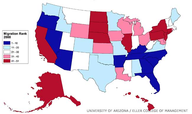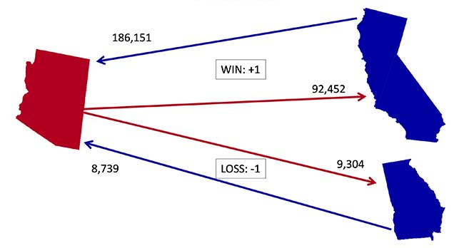 Exhibit 1 illustrates the approach using gross migration flows from Census 2000. These flows are measured from 1995-2000. During that period, 92,452 Arizona residents moved to California. However, 186,151 California residents moved to Arizona. We classify this as a “win” for Arizona versus California and post a +1 in Arizona’s win/loss record. In contrast, during the 1995-2000 period, 9,304 Arizona residents moved to Georgia, while 8,739 Georgia residents moved to Arizona. In this case, Arizona “loses” to Georgia and we post a -1 in Arizona’s win/loss record. And so on until we have a complete win/loss record for Arizona versus all states. The sum of Arizona’s “wins” and “losses” is the state’s overall score.