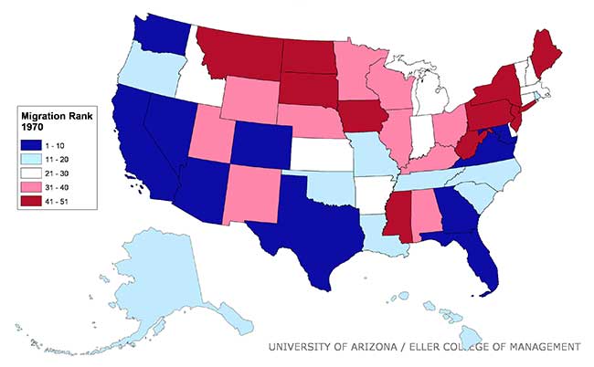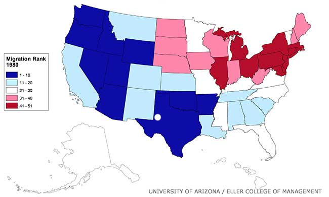 However, it is important to keep in mind that domestic migrants are probably not choosing to locate in the state in order to increase income. As Exhibit 8 shows, Arizona’s per capita personal income has consistently been below the national average during the period. In addition, the gap has increased rapidly lately. In 2013, Arizona’s per capita personal income was 16.8% below the nation and ranked the state 42th out of 50 states and the District of Columbia. Instead, migrants likely chose the state for other reasons, perhaps a climate that is dry and warm in the winter or rapid job growth. Exhibit 9 displays numerical ranking for all fifty states from 1970 through to the 2008-2012 period.