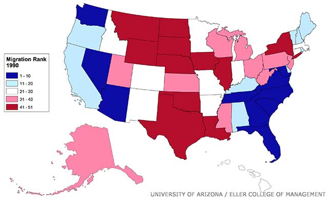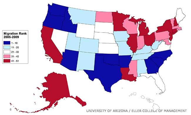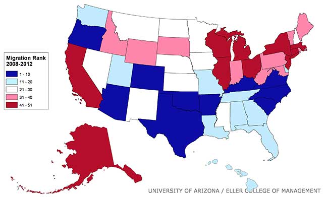 Arizona remains in the top 10 throughout the period, reflecting the fact that the state is a relatively attractive migration destination. Nonetheless, the state was impacted by the Great Recession, with a decline in the state’s rank from second during the 2005-2009 period to 10th during the 2008-2012 period.