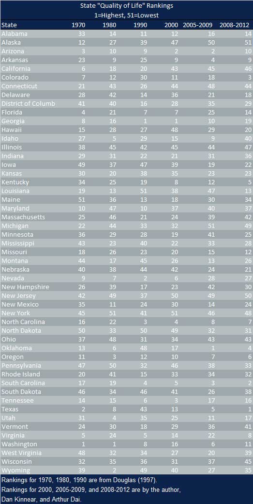 This implies that we can use domestic migration data from the U.S. Census Bureau to rank states based on their “quality of life,” from the perspective of individuals moving around the U.S. A methodology to accomplish this ranking was established by Douglas (1997)1.