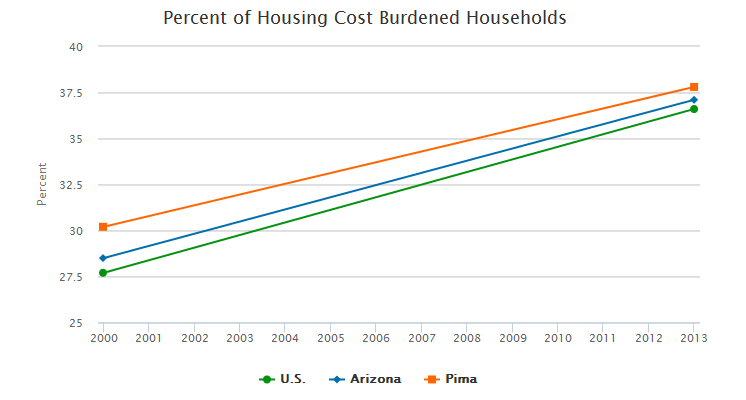 Pima County and Arizona had a similar percentage of households that were housing cost burdened in 2013 (37.8% and 37.1%, respectively), and both posted slightly higher rates than the U.S. (36.6%). All three regions have seen a significant increase in the percentage of cost burdened households since 2000. The U.S. posted an increase of 9.0 percentage points, while Arizona and Pima County increased by 8.5 and 7.6 percentage points respectively.