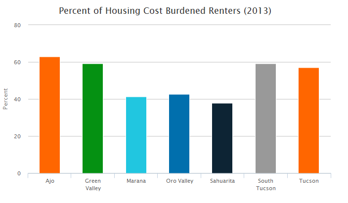 Cities located throughout Pima County displayed wide variation in the percentage of households that were cost burdened in 2013. Green Valley had the lowest percentage of cost burden households (23.0%), while South Tucson the highest (53.0%). City of Tucson posted a housing cost burden rate of 43.1%, 5.3 percentage points higher than the county.